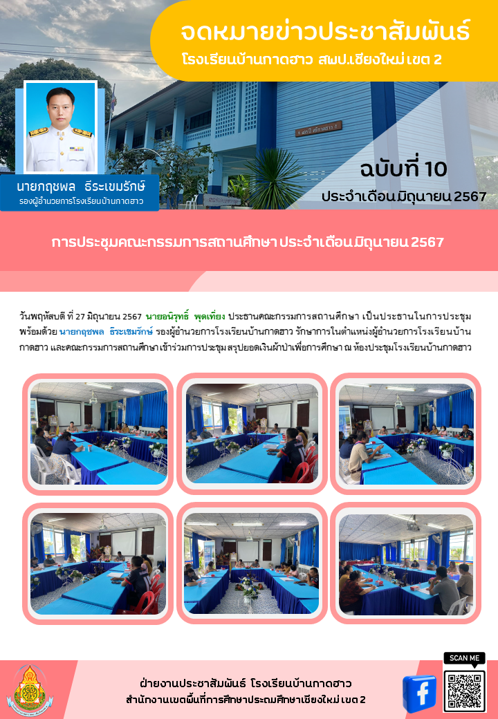 วันพฤหัสบดี ที่ 27 มิถุนายน 2567 นายอนิรุทธิ์ พุดเที่ยง ประธานคณะกรรมการสถานศึกษา เป็นประธานในการประชุมพร้อมด้วย นายกฤชพล ธีระเขมรักษ์ รองผู้อำนวยการโรงเรียนบ้านกาดฮาว รักษาการในตำแหน่งผู้อำนวยการโรงเรียนบ้านกาดฮาว และคณะกรรมการสถานศึกษา เข้าร่วมการประชุม สรุปยอดเงินผ้าป่าเพื่อการศึกษา ณ ห้องประชุมโรงเรียนบ้านกาดฮาว