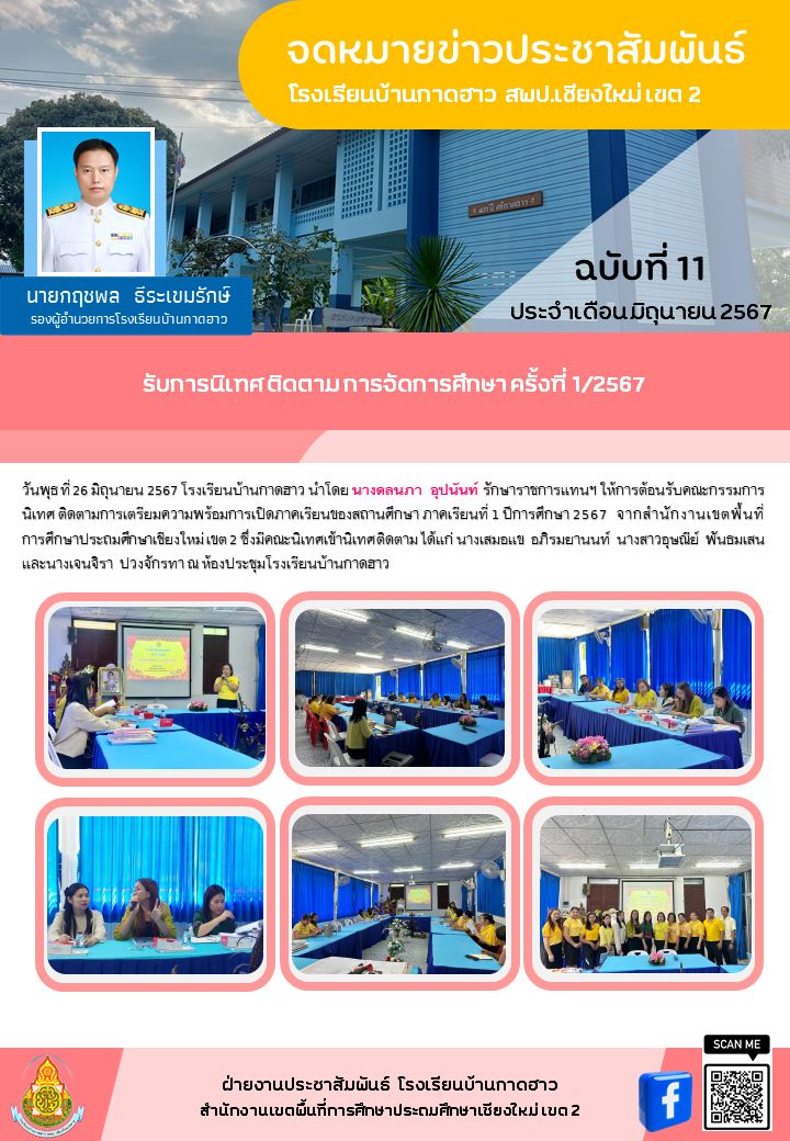 วันพุธ ที่ 26 มิถุนายน 2567 โรงเรียนบ้านกาดฮาว นำโดย นางดลนภา อุปนันท์ รักษาราชการแทนฯ ให้การต้อนรับคณะกรรมการนิเทศ ติดตามการเตรียมความพร้อมการเปิดภาคเรียนของสถานศึกษา ภาคเรียนที่ 1 ปีการศึกษา 2567 จากสำนักงานเขตพื้นที่การศึกษาประถมศึกษาเชียงใหม่ เขต 2 ซึ่งมีคณะนิเทศเข้านิเทศ ติดตาม ได้แก่ นางเสมอแข อภิรมยานนท์ นางสาวอุษณีย์ พันธมเสน และนางเจนจิรา ปวงจักรทา ณ ห้องประชุมโรงเรียนบ้านกาดฮาว