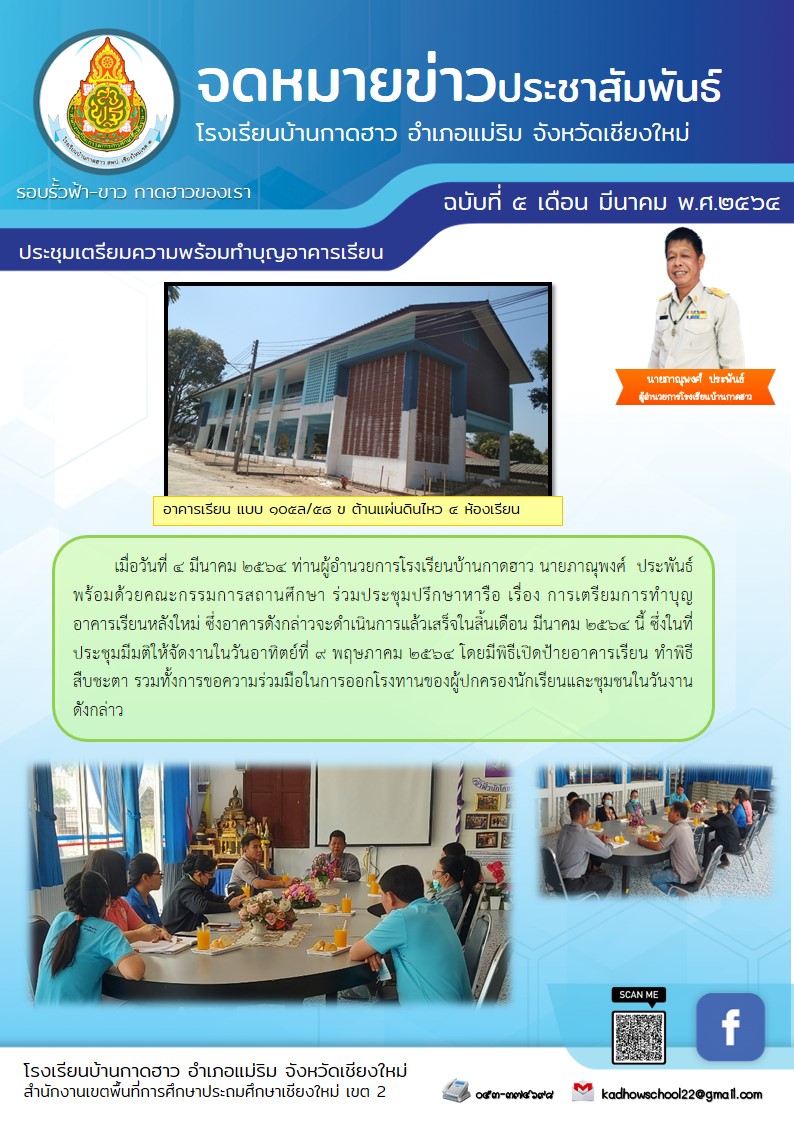 เมื่อวันที่ 4 มีนาคม 2564 ท่านผู้อำนวยการโรงเรียนบ้านกาดฮาว นายภาณุพงศ์ ประพันธ์ พร้อมด้วยคณะกรรมการสถานศึกษา ร่วมประชุมปรึกษาหารือ เรื่อง การเตรียมการทำบุญอาคารเรียนหลังใหม่ ซึ่งอาคารดังกล่าวจะดำเนินการแล้วเสร็จในสิ้นเดือน มีนาคม ๒๕๖๔ นี้ ซึ่งในที่ประชุมมีมติให้จัดงานในวันอาทิตย์ที่ ๙ พฤษภาคม ๒๕๖๔ โดยมีพิธีเปิดป้ายอาคารเรียน ทำพิธีสืบชะตา รวมทั้งการขอความร่วมมือในการออกโรงทานของผู้ปกครองนักเรียนและชุมชนในวันงานดังกล่าว