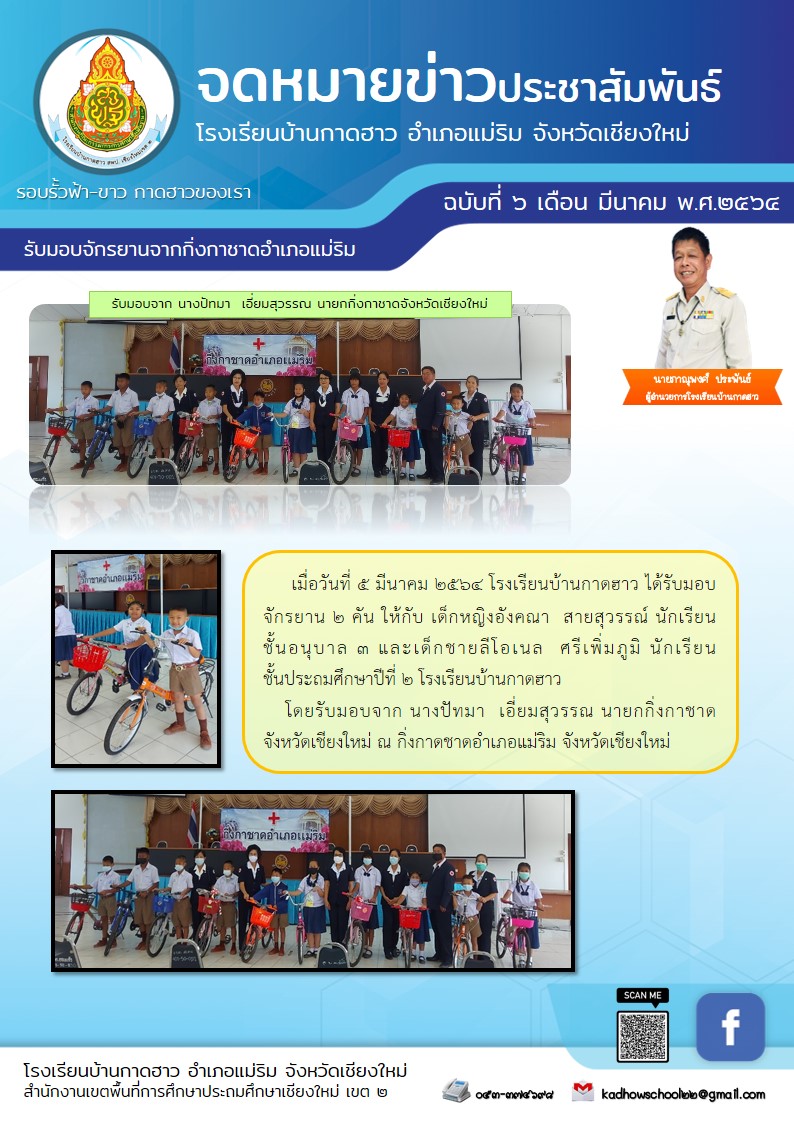 โรงเรียนบ้านกาดฮาวโดยรับมอบจาก นางปัทมา เอี่ยมสุวรรณ นายกกิ่งกาชาดจังหวัดเชียงใหม่ ณ กิ่งกาดชาดอำเภอแม่ริม จังหวัดเชียงใหม่