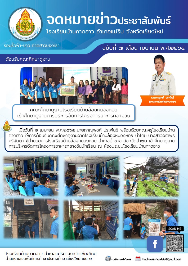 เมื่อวันที่ ๒ เมษายน พ.ศ.๒๕๖๔ นายภาณุพงศ์ ประพันธ์ พร้อมด้วยคณะครูโรงเรียนบ้านกาดฮาว ให้การต้อนรับคณะศึกษาดูงานจากโรงเรียนบ้านล้องหนองหอย นำโดย..นางสาวจิราพร ศรีจันตา ผู้อำนวยการโรงเรียนบ้านล้องหนองหอย อำเภอป่าซาง จังหวัดลำพูน เข้าศึกษาดูงานการบริหารจัดการโครงการอาหารกลางวันนักเรียน ณ ห้องประชุมโรงเรียนบ้านกาดฮาว