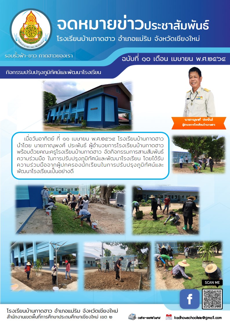 เมื่อวันอาทิตย์ ที่ ๑๑ เมษายน พ.ศ.๒๕๖๔ โรงเรียนบ้านกาดฮาว นำโดย นายภาณุพงศ์ ประพันธ์ ผู้อำนวยการโรงเรียนบ้านกาดฮาว พร้อมด้วยคณะครูโรงเรียนบ้านกาดฮาว จัดกิจกรรมการสานสัมพันธ์ความร่วมมือ ในการปรับปรุงภูมิทัศน์และพัฒนาโรงเรียน โดยได้รับความร่วมมือจากผู้ปกครองนักเรียนในการปรับปรุงภูมิทัศน์และพัฒนาโรงเรียนเป็นอย่างดี