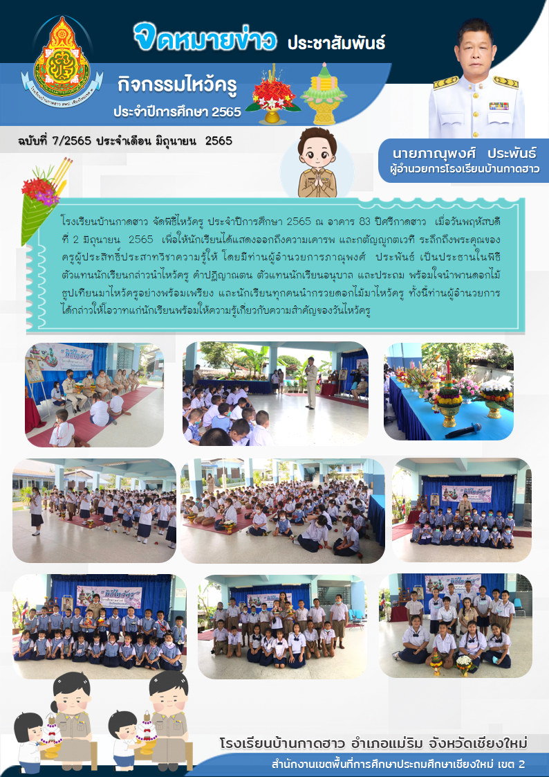 โรงเรียนบ้านกาดฮาว จัดพิธีไหว้ครู ประจำปีการศึกษา 2565 ณ อาคาร 83 ปีศรีกาดฮาว เมื่อวันพฤหัสบดี ที่ 2 มิถุนายน 2565 เพื่อให้นักเรียนได้แสดงออกถึงความเคารพ และกตัญญูกตเวที ระลึกถึงพระคุณของครูผู้ประสิทธิ์ประสาทวิชาความรู้ให้ โดยมีท่านผู้อำนวยการภาณุพงศ์ ประพันธ์ เป็นประธานในพิธี