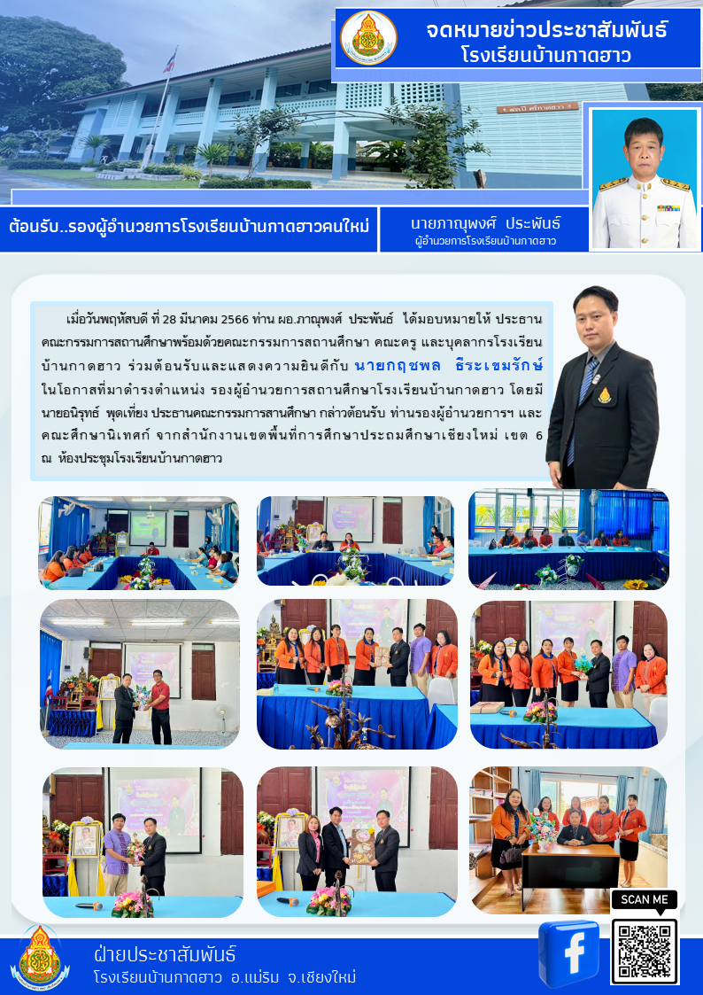 เมื่อวันพฤหัสบดี ที่ 28 มีนาคม 2566 ท่าน ผอ.ภาณุพงศ์ ประพันธ์ ได้มอบหมายให้ ประธานคณะกรรมการสถานศึกษาพร้อมด้วยคณะกรรมการสถานศึกษา คณะครู และบุคลากรโรงเรียนบ้านกาดฮาว ร่วมต้อนรับและแสดงความยินดีกับ นายกฤชพล ธีระเขมรักษ์ ในโอกาสที่มาดำรงตำแหน่ง รองผู้อำนวยการสถานศึกษาโรงเรียนบ้านกาดฮาว โดยมีนายอนิรุทธ์ พุดเที่ยง ประธานคณะกรรมการสานศึกษา กล่าวต้อนรับ ท่านรองผู้อำนวยการฯ และคณะศึกษานิเทศก์ จากสำนักงานเขตพื้นที่การศึกษาประถมศึกษาเชียงใหม่ เขต 6 ณ ห้องประชุมโรงเรียนบ้านกาดฮาว