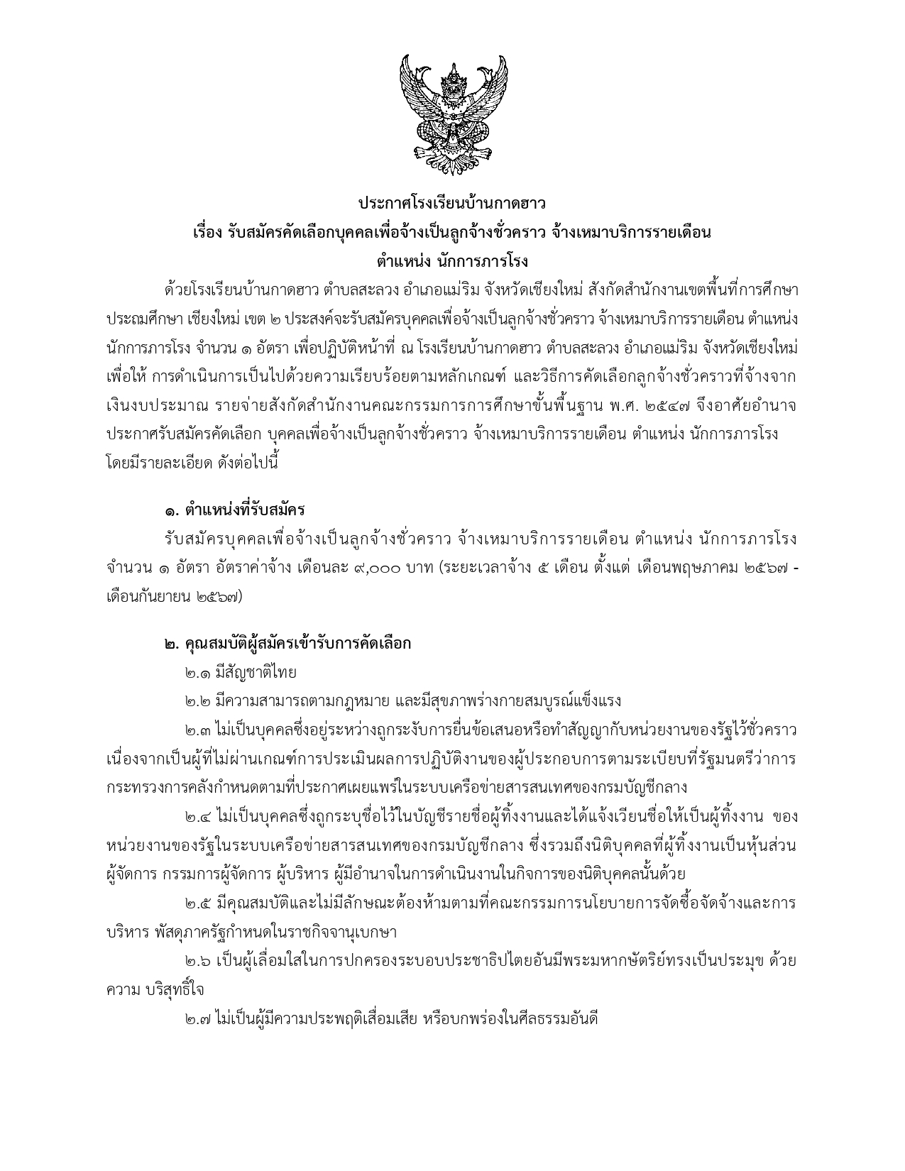 ประกาศโรงเรียนบ้านกาดฮาว เรื่อง รับสมัครคัดเลือกบุคคลเพื่อจ้างเป็นลูกจ้างชั่วคราว จ้างเหมาบริการรายเดือน ตำแหน่ง นักการภารโรง