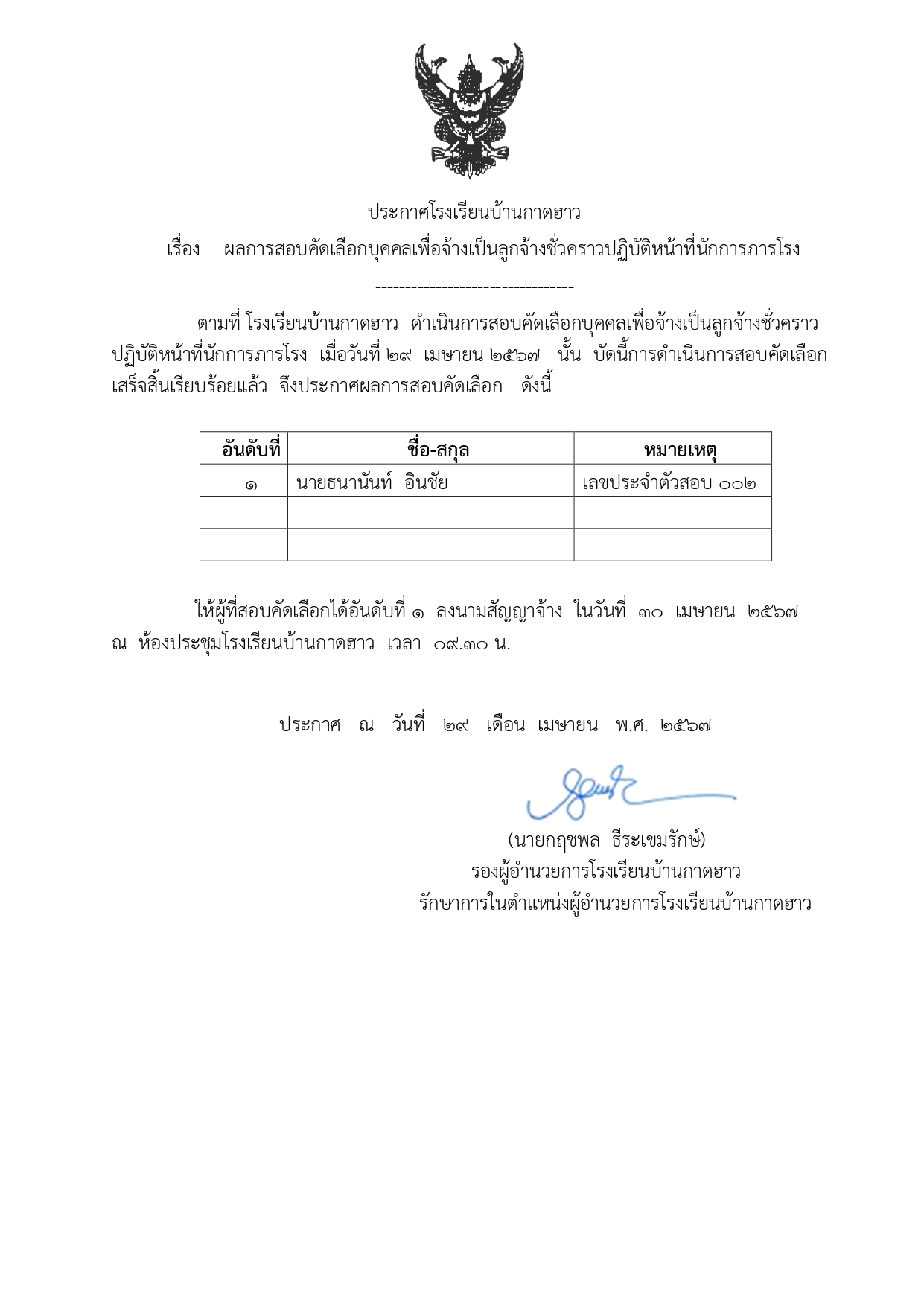 ผลการสอบคัดเลือกบุคคลเพื่อจ้างเป็นลูกจ้างชั่วคราวปฏิบัติหน้าที่นักการภารโรง