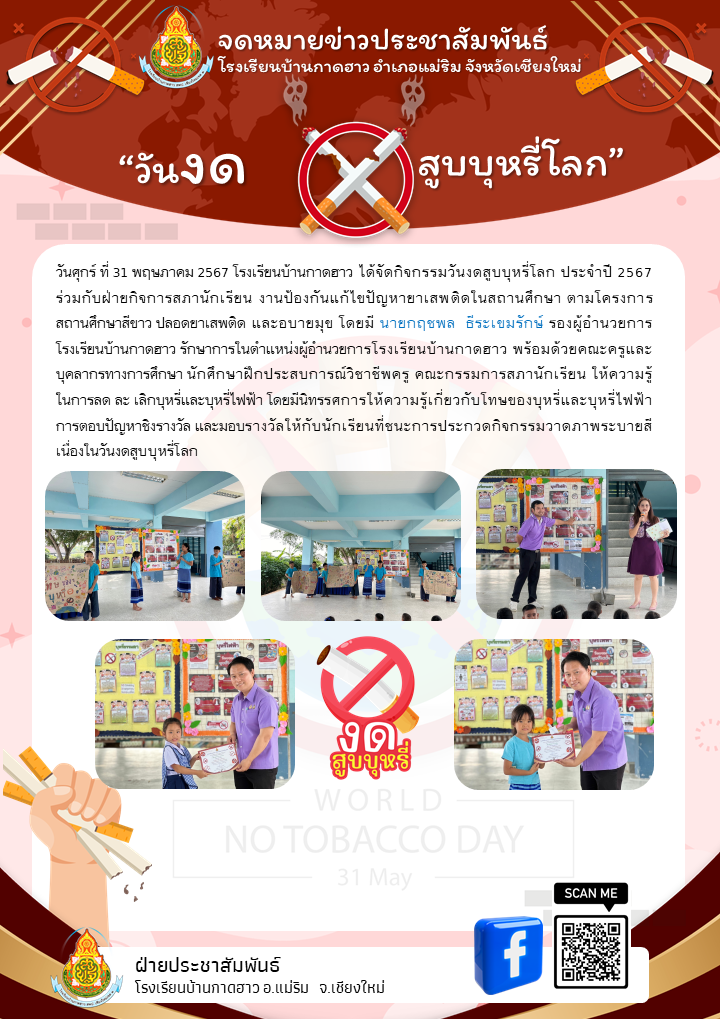 วันศุกร์ ที่ 31 พฤษภาคม 2567 โรงเรียนบ้านกาดฮาว ได้จัดกิจกรรมวันงดสูบบุหรี่โลก ประจำปี 2567 ร่วมกับฝ่ายกิจการสภานักเรียน งานป้องกันแก้ไขปัญหายาเสพติดในสถานศึกษา ตามโครงการสถานศึกษาสีขาว ปลอดยาเสพติด และอบายมุข โดยมี นายกฤชพล ธีระเขมรักษ์ รองผู้อำนวยการโรงเรียนบ้านกาดฮาว รักษาการในตำแหน่งผู้อำนวยการโรงเรียนบ้านกาดฮาว พร้อมด้วยคณะครูและบุคลากรทางการศึกษา นักศึกษาฝึกประสบการณ์วิชาชีพครู คณะกรรมการสภานักเรียน ให้ความรู้ในการลด ละ เลิกบุหรี่และบุหรี่ไฟฟ้า โดยมีนิทรรศการให้ความรู้เกี่ยวกับโทษของบุหรี่และบุหรี่ไฟฟ้า การตอบปัญหาชิงรางวัล และมอบรางวัลให้กับนักเรียนที่ชนะการประกวดกิจกรรมวาดภาพระบายสีเนื่องในวันงดสูบบุหรี่โลก