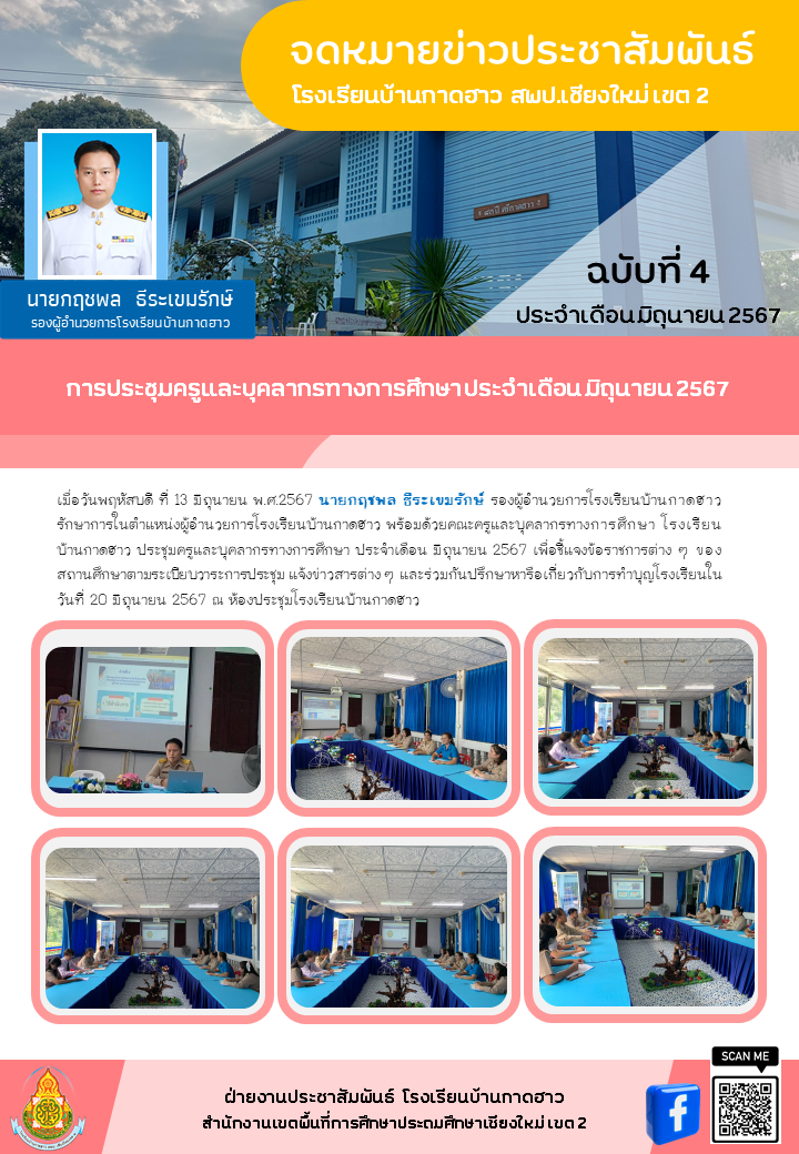 เมื่อวันพฤหัสบดี ที่ 13 มิถุนายน พ.ศ.2567 นายกฤชพล ธีระเขมรักษ์ รองผู้อำนวยการโรงเรียนบ้านกาดฮาว รักษาการในตำแหน่งผู้อำนวยการโรงเรียนบ้านกาดฮาว พร้อมด้วยคณะครูและบุคลากรทางการศึกษา โรงเรียนบ้านกาดฮาว ประชุมครูและบุคลากรทางการศึกษา ประจำเดือน มิถุนายน 2567 เพื่อชี้แจงข้อราชการต่าง ๆ ของสถานศึกษาตามระเบียบวาระการประชุม แจ้งข่าวสารต่าง ๆ และร่วมกันปรึกษาหารือเกี่ยวกับการทำบุญโรงเรียนในวันที่ 20 มิถุนายน 2567 ณ ห้องประชุมโรงเรียนบ้านกาดฮาว