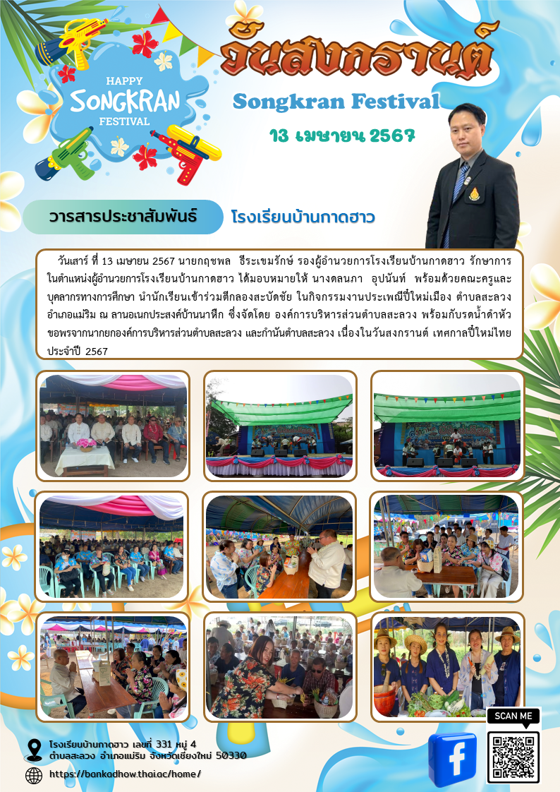 วันเสาร์ ที่ 13 เมษายน 2567 นายกฤชพล  ธีระเขมรักษ์ รองผู้อำนวยการโรงเรียนบ้านกาดฮาว รักษาการในตำแหน่งผู้อำนวยการโรงเรียนบ้านกาดฮาว ได้มอบหมายให้ นางดลนภา  อุปนันท์  พร้อมด้วยคณะครูและบุคลากรทางการศึกษา นำนักเรียนเข้าร่วมตีกลองสะบัดชัย ในกิจกรรมงานประเพณีปี๋ใหม่เมือง ตำบลสะลวง อำเภอแม่ริม ณ ลานอเนกประสงค์บ้านนาหืก ซึ่งจัดโดย องค์การบริหารส่วนตำบลสะลวง พร้อมกับรดน้ำดำหัวขอพรจากนากยกองค์การบริหารส่วนตำบลสะลวง และกำนันตำบลสะลวง เนื่องในวันสงกรานต์ เทศกาลปี๋ใหม่ไทย ประจำปี 2567
